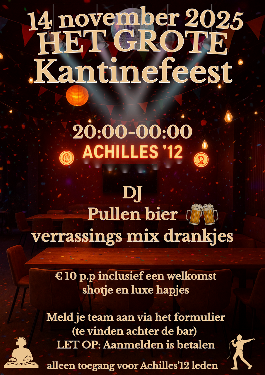 Zet vrijdag 14 november in je agenda. Dan is het grote kantinefeest van 20:00 tot 00:00 in het clubhuis. Zie hieronder informatie over het aanmelden.