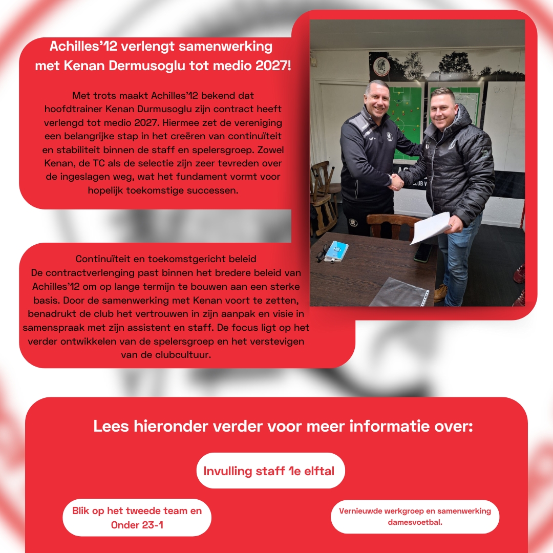 Met trots maakt Achilles ’12 bekend dat hoofdtrainer Kenan Durmusoglu zijn contract heeft verlengd tot medio 2027. Hiermee zet de vereniging een belangrijke stap in het creëren van continuïteit en stabiliteit binnen de staf en spelersgroep. Zowel Kenan, de Technische Commissie als de selectie zijn zeer tevreden over de ingeslagen weg, wat het fundament vormt voor hopelijk toekomstige successen.